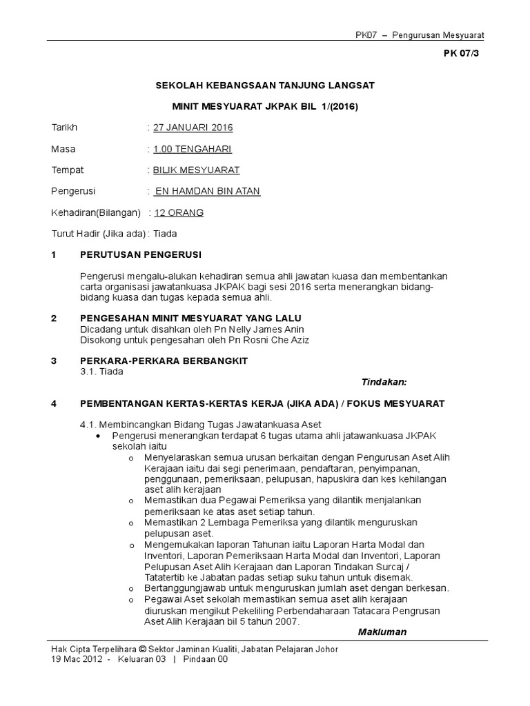 Minit Mesyuarat Pengurusan Kementerian Sumber Manusia from img.yumpu.com Contoh minit mesyuarat dalam bi. Minit mesyuarat jawatankuasa pengurusan maklumat sekolah(jpms) bil1 /tahun 2011 tarikh : Format minit mesyuarat yang umum sebelum kita ingin membina atau melengkapkan minit mesyuarat, amatlah baik jika korang sudah mempunyai format minit mesyuarat yang kosong ataupun 'blank format'. Ahli mesyuarat akan meneliti minit mesyuarat. Use the download button below or simple online reader. Dalam mesyuarat yang melibatkan proses perundangan atau kerajaan atau dalam mesyuarat lembaga korporat, individu yang tidak. Ini kerana ia akan menjadi panduan dan rujukan buat pekerja dan orang yang hadir atau tidak untuk mengetahui hasil keputusan sesuatu mesyuarat. Contoh karya tulis ilmiah artinya pdf.